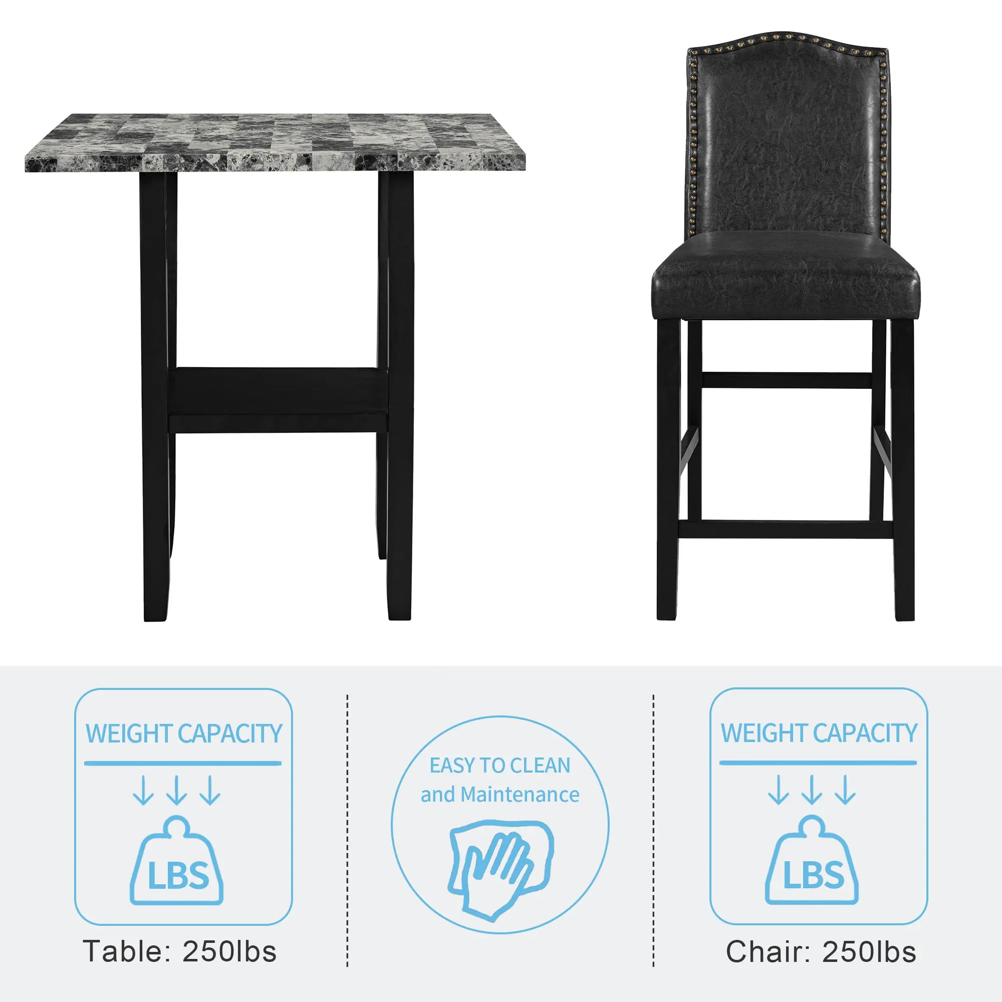 [Quality Construction] Manufactured from premium MDF and rubber wood, this dining set is built to last and has a strengthened capacity to prevent any weight-associated damage. The marble pattern veneer is highly resistant to scratch, erosion and untimely wear from daily usage, keeping the surface well-preserved through years of dedicated use.