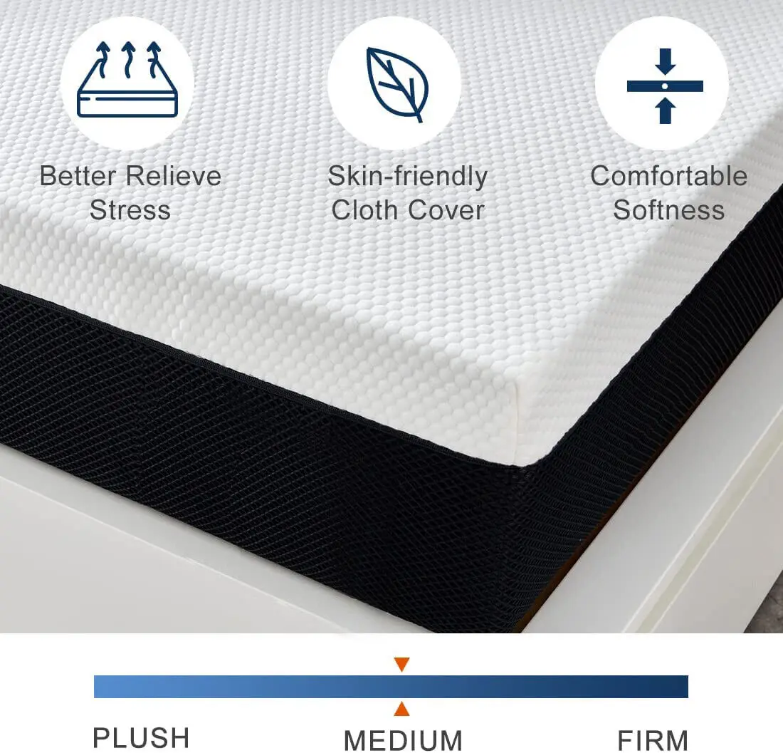 10 inch Memory Foam Mattress is designed with three layers all-foam system, improving support and heat dissipation, mattress layers include 2 inches memory foam,4 inches of comfortable layer ,and 4 inches of high density base support foam for ultimate comfort. It includes a soft hypoallergenic cover layer that is washable for your convenience.