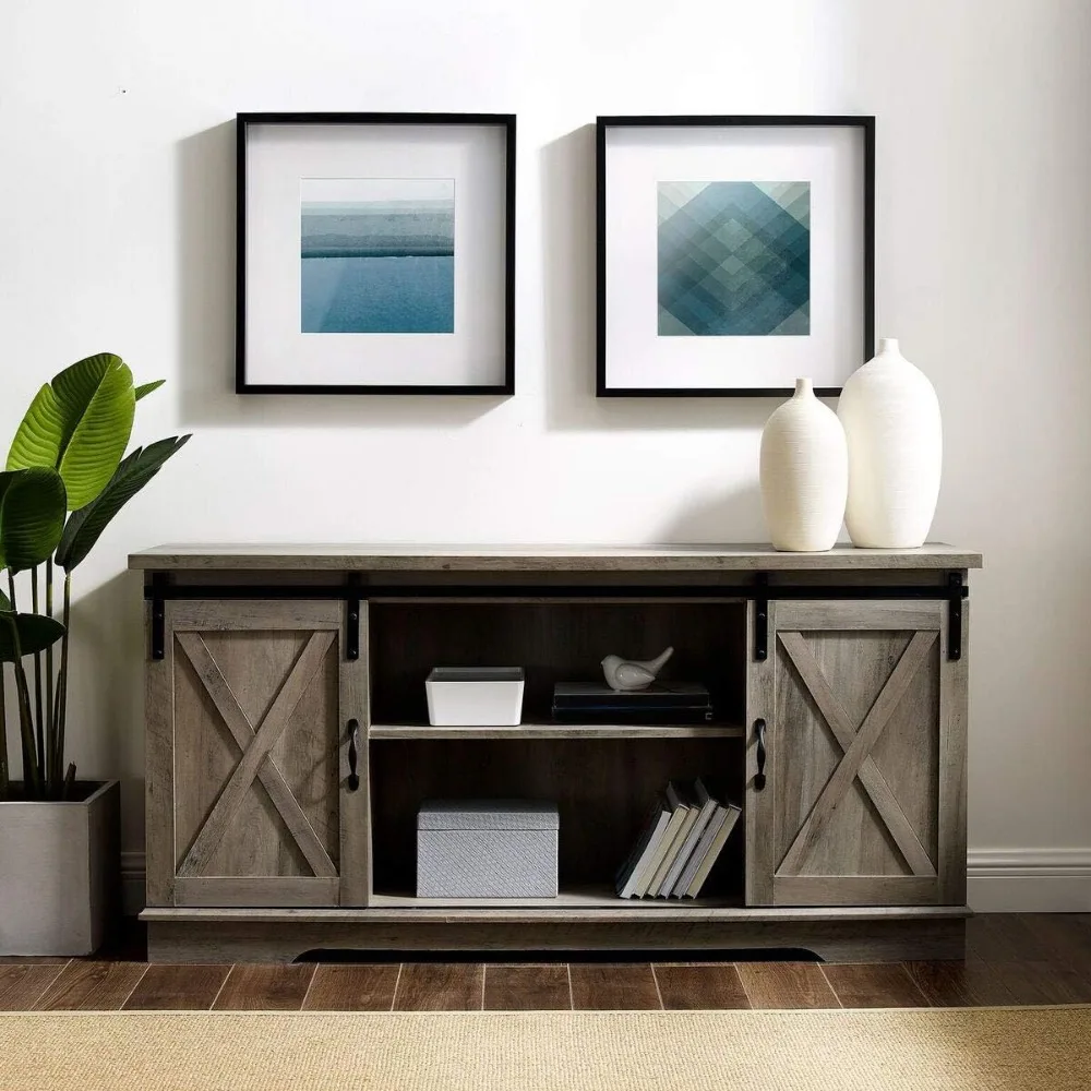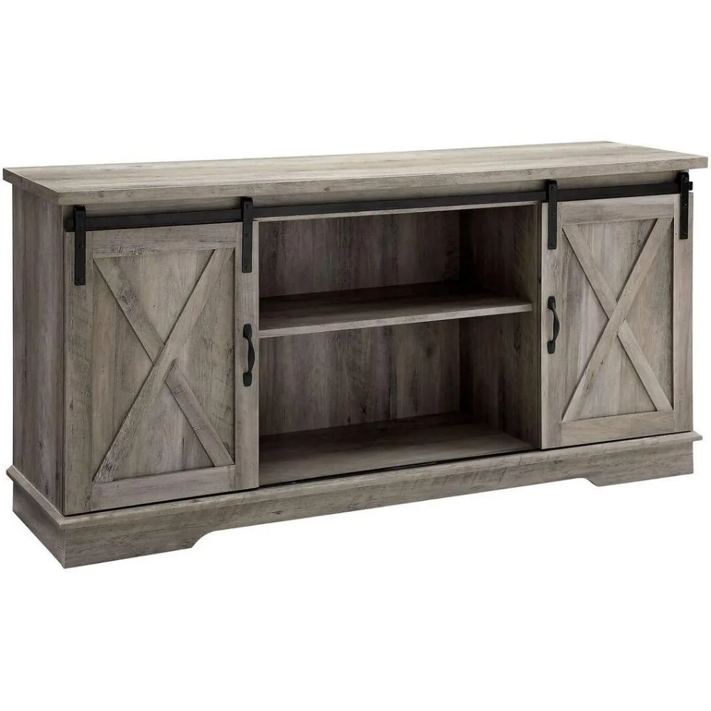 This TV stand will give your living room a charming country feel, while also providing plenty of storage space for your electronics and décor. Featuring two sliding barn door styled cabinet fronts for a versatile design where you can either close off the middle or both sides, depending on your needs. Adjustable shelving and cable management make it simple for you to keep your electronics in one place. This media console is constructed of high-grade MDF. The modern farmhouse style of this entertainment center will become a piece in your living room you'll admire.