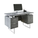 • Large floating top work surface, paired with two sleek silver track metal legs