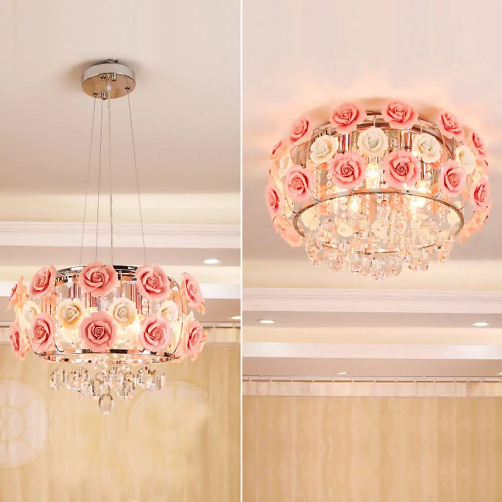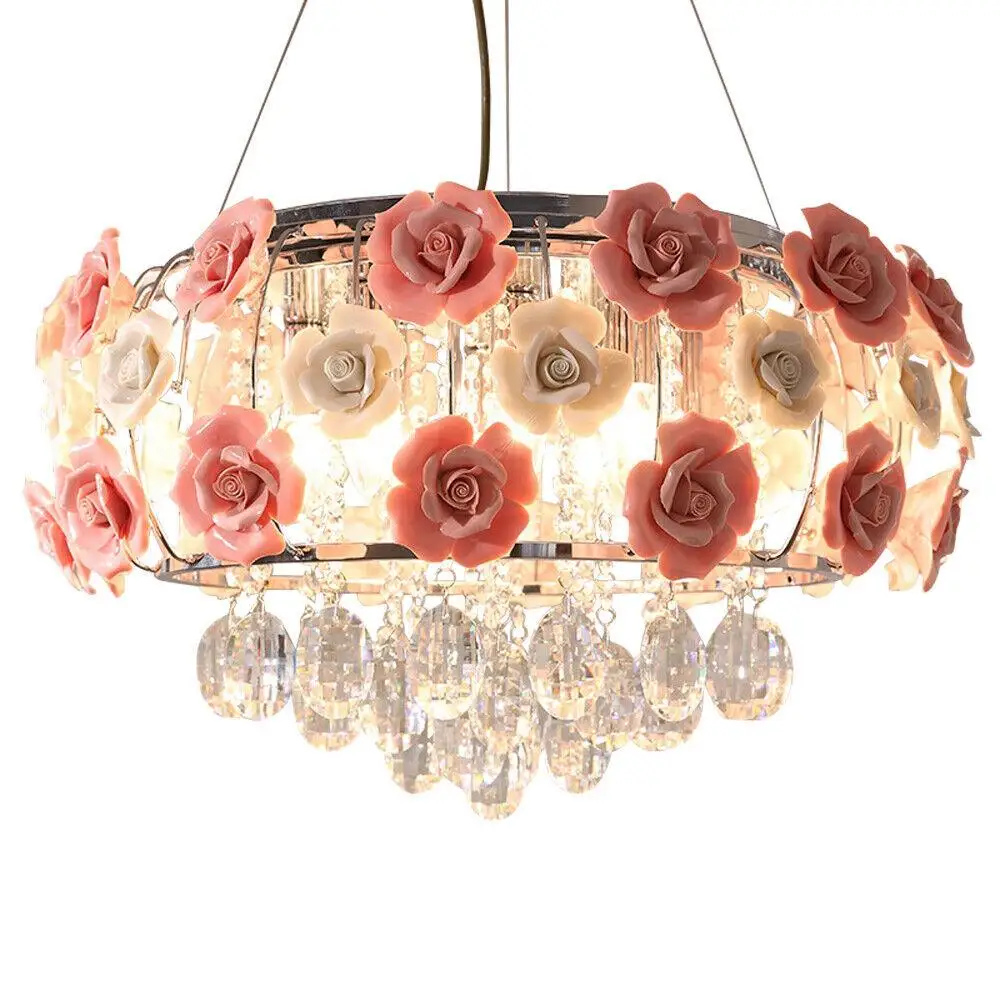 Modern Pink Crystal Chandelier Romantic Rose Flower Ceiling Lamp Pendant Light Girl Room Luxury Princess