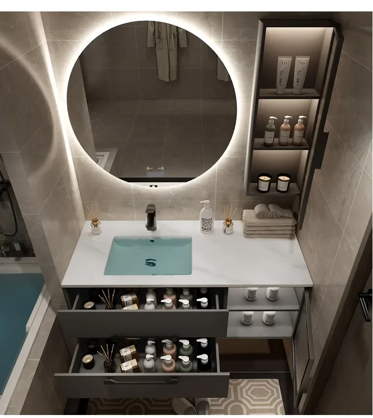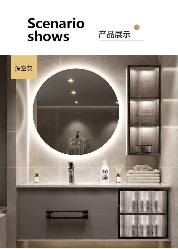 Description: The Modern Simple Slate Integrated Basin Hang Bathroom Vanity Cabinet with Sink Combination is a luxurious and smart choice for your bathroom. The cabinet features a seamless integration of the basin and sink for a clean and streamlined look. The cabinet is made with high-quality materials, including slate, to ensure durability and longevity. The light feature adds a touch of elegance to the bathroom, creating a warm and inviting atmosphere. The sink is perfect for hand washing, making it a convenient and practical choice for everyday use. With its modern and simple design, this bathroom vanity cabinet will complement any bathroom decor and upgrade the overall look of your space. The cabinet's storage space provides ample room for all your bathroom essentials, keeping everything organized and within reach. This combination is floor-standing, providing stability and a sleek appearance. Whether you're remodeling your bathroom or just looking to upgrade, this Modern Simple Slate Integrated Basin Hang Bathroom Vanity Cabinet with Sink Combination is an excellent choice.