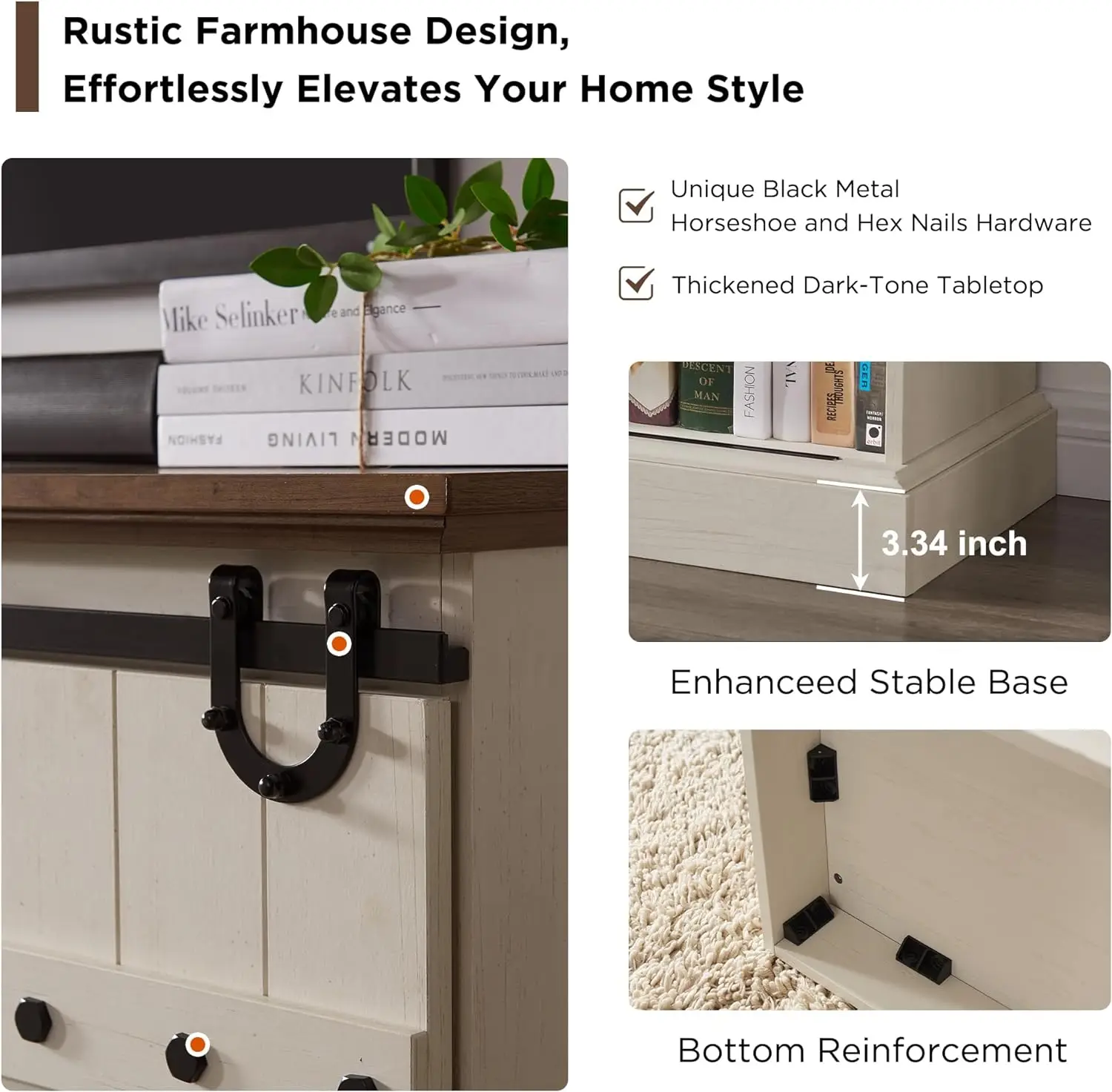 - Meticulously Crafted with Design Details - Effortlessly stylish, the chic metal track ensures the barn door glides with a seamless ease, creating a focal point of smooth functionality. Five cable holes maintain wire tidiness, while sliding barn doors offer convenient access and save space. The distinctive protruding design on the base front imparts a charming retro atmosphere, blending timeless aesthetics with rustic appeal. Elevate your space with functional elegance.