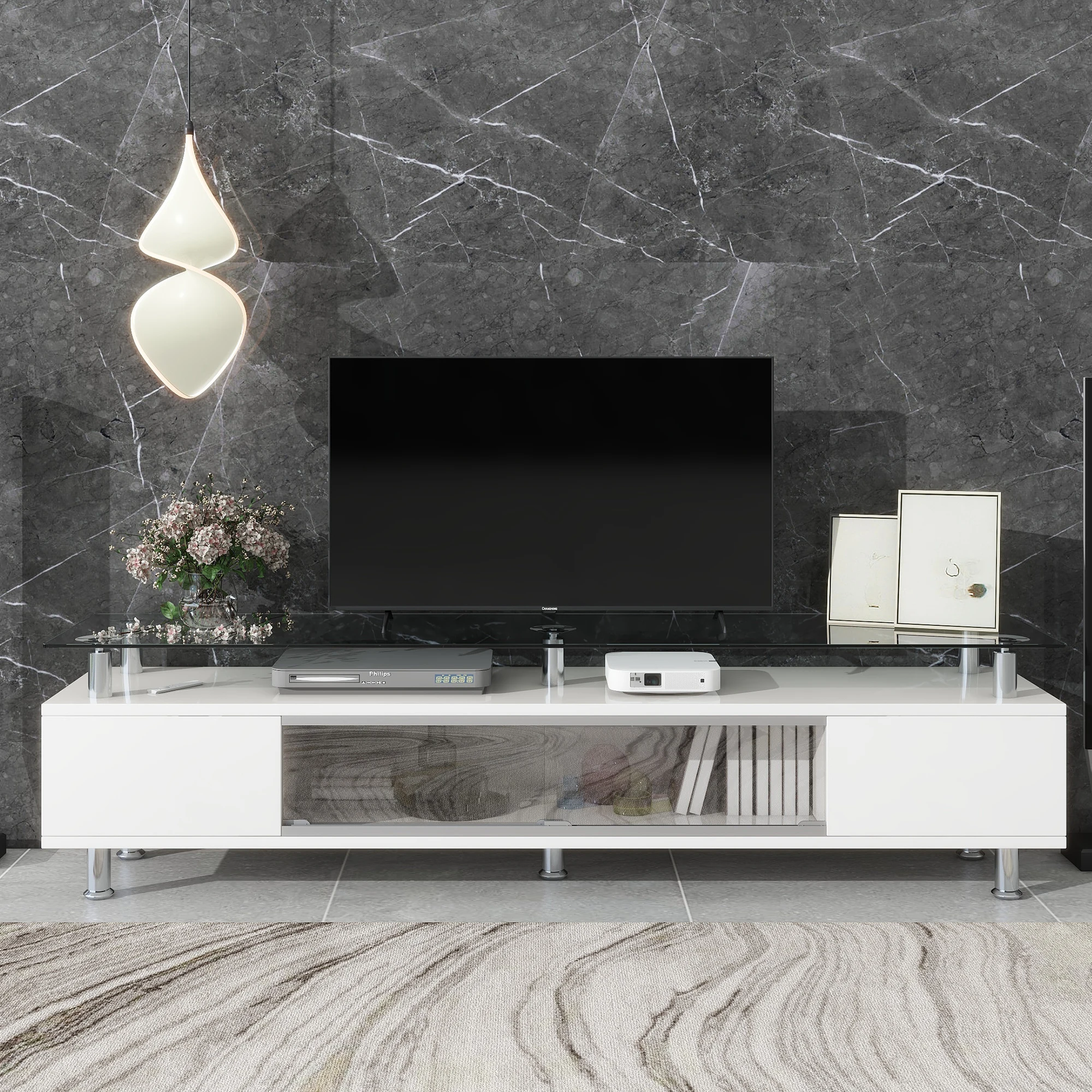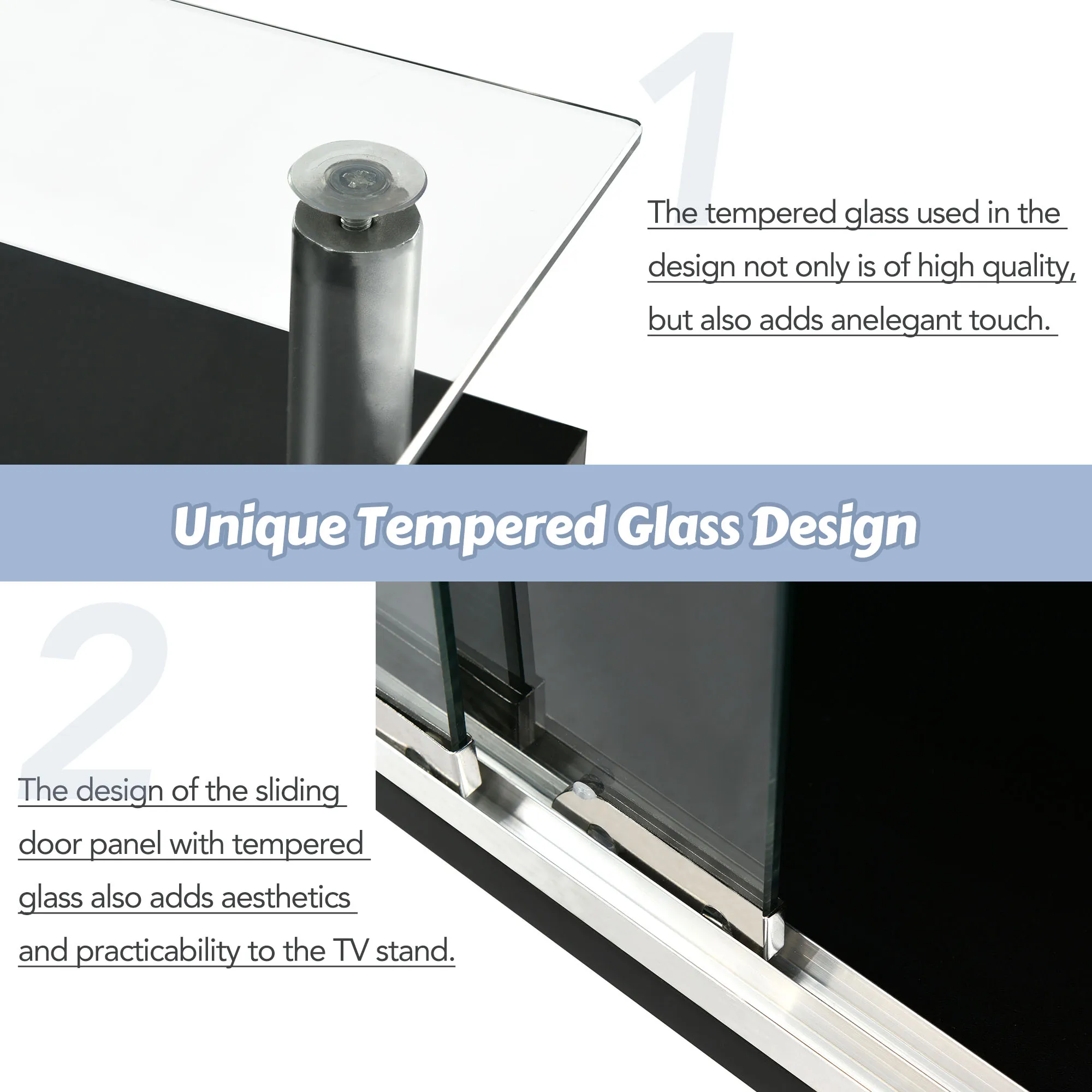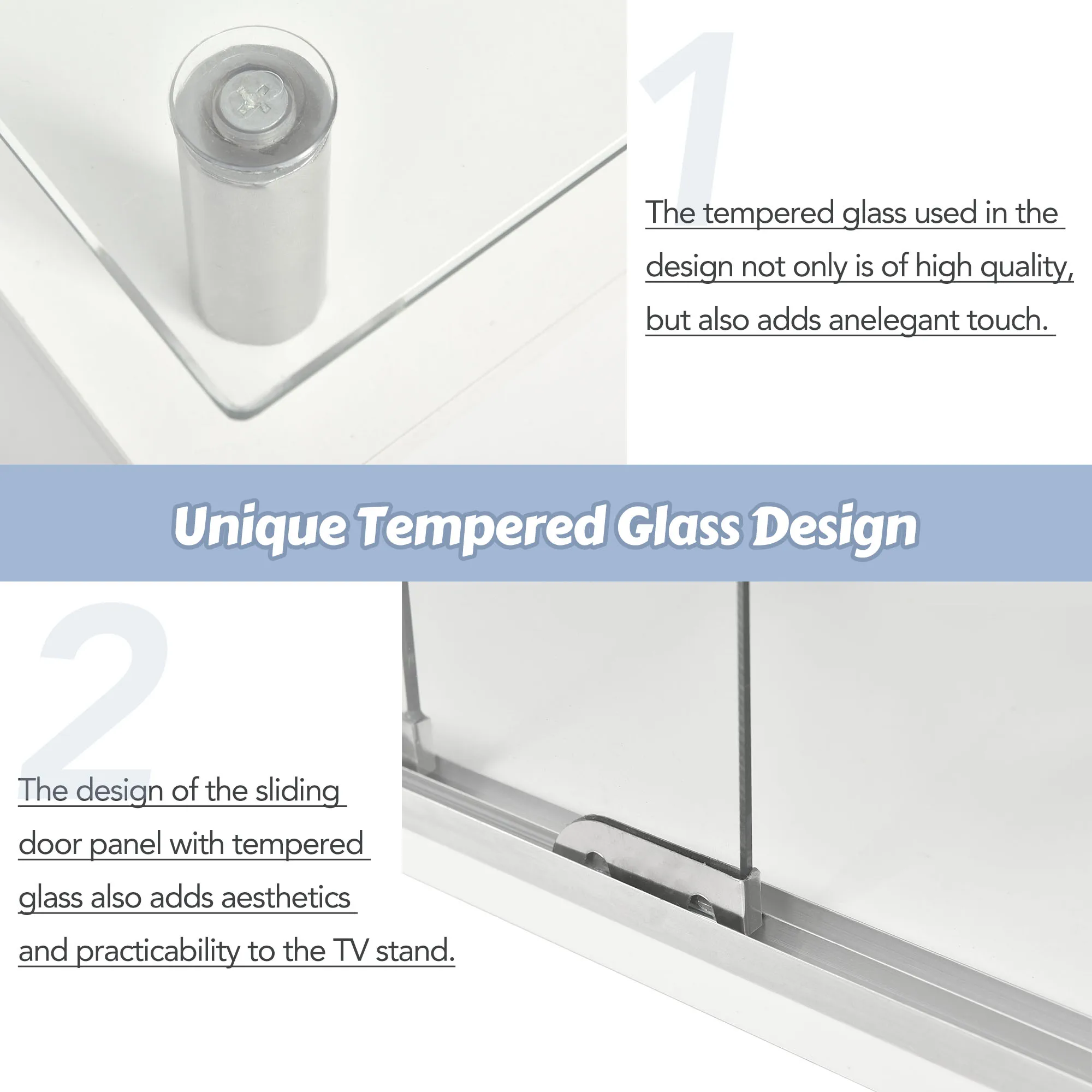 [Flash Sale]Sleek Design TV Stand with Silver Metal Legs&Ample Storage Capacity for TV Up to 70" Tempered Glass TV Cabinet Contemporary Media Console with Sliding Glass Door for Living Room White/Black[US-W]