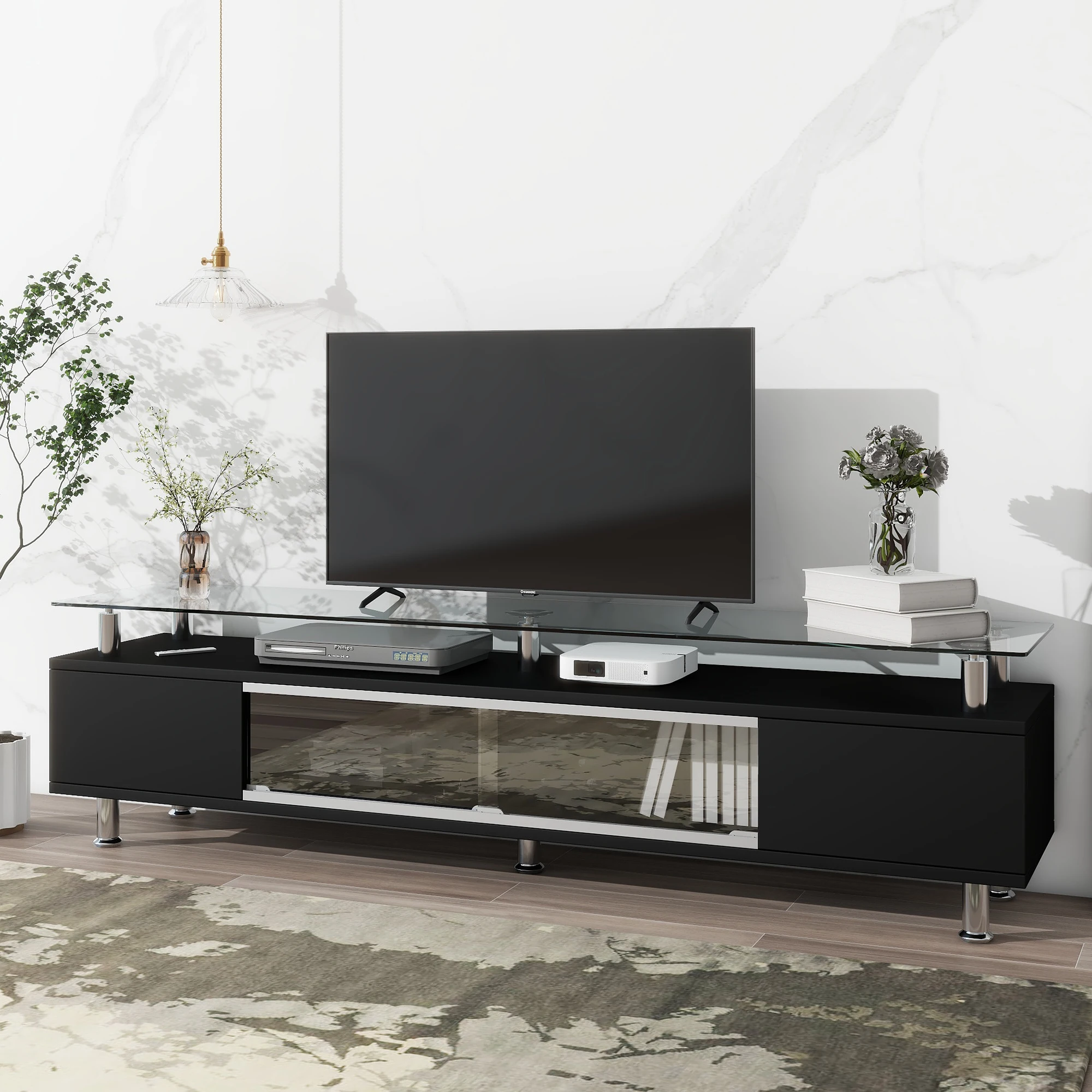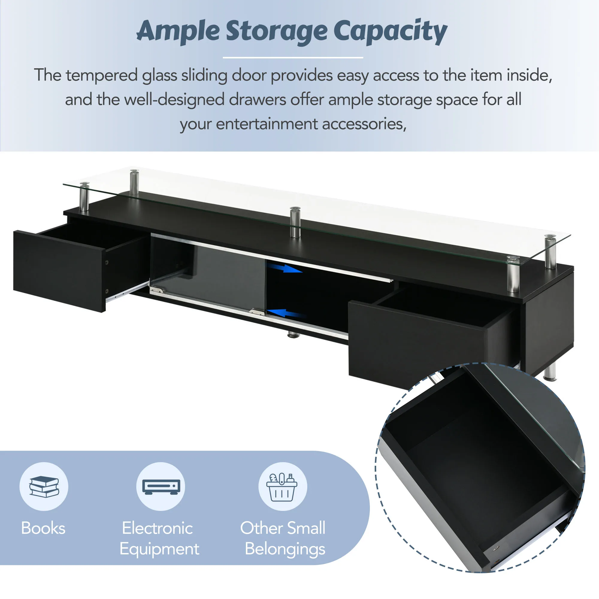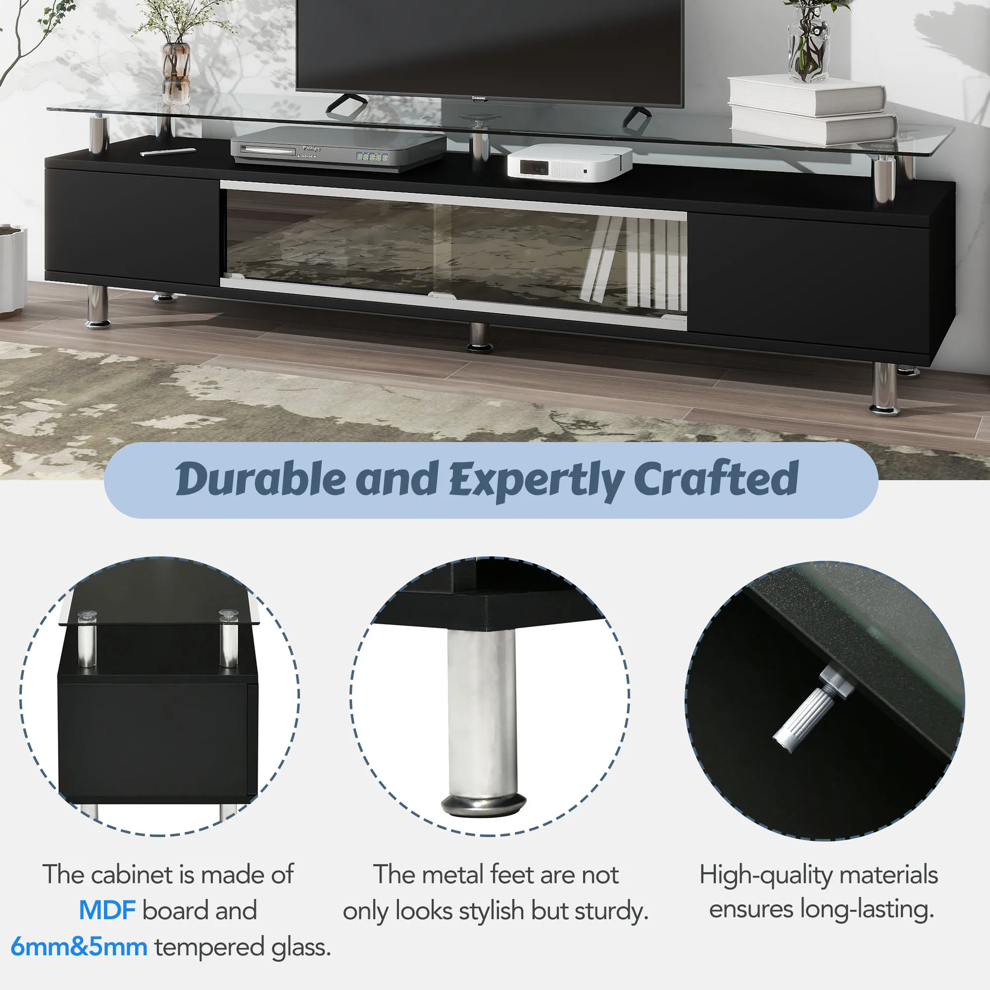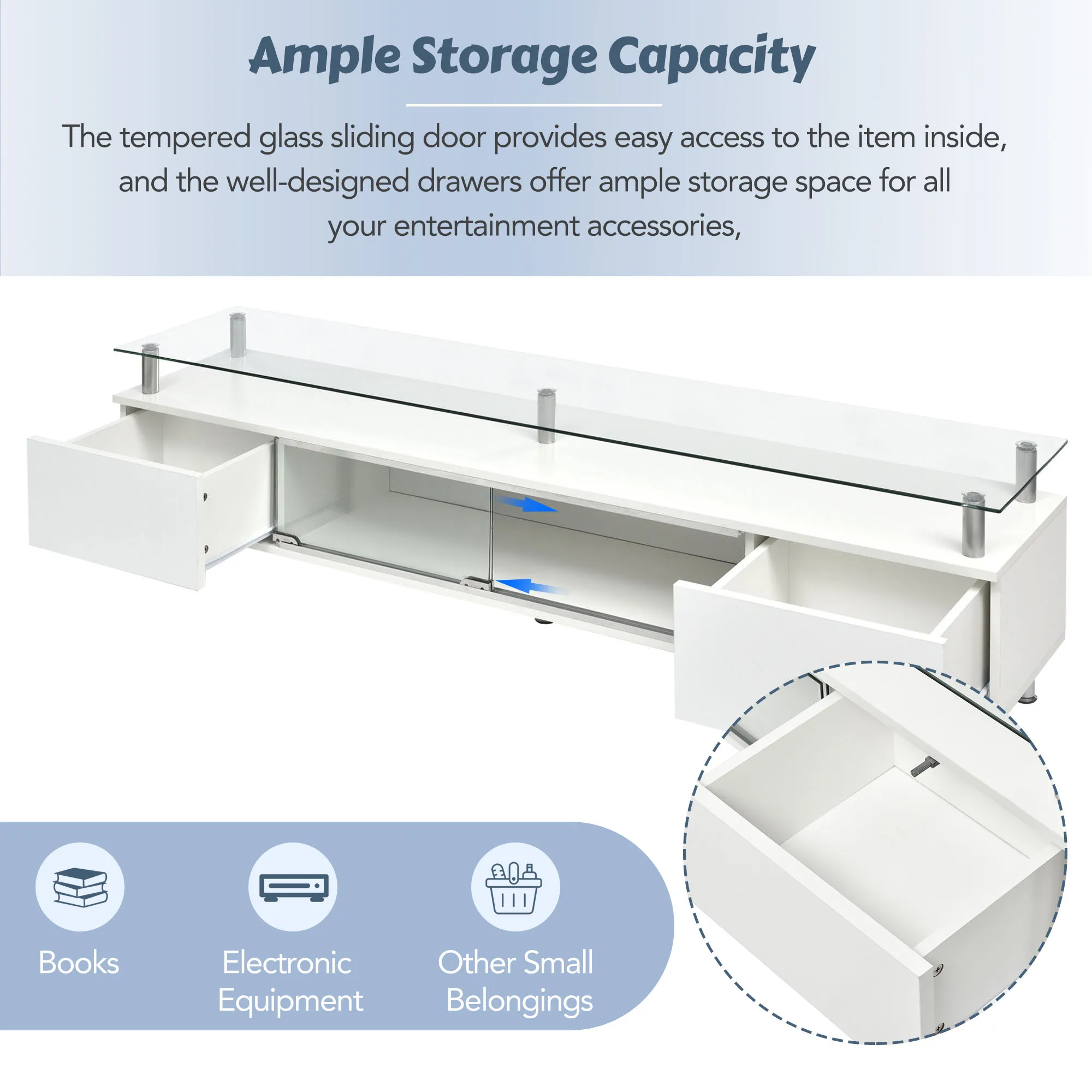 [Flash Sale]Sleek Design TV Stand with Silver Metal Legs&Ample Storage Capacity for TV Up to 70" Tempered Glass TV Cabinet Contemporary Media Console with Sliding Glass Door for Living Room White/Black[US-W]