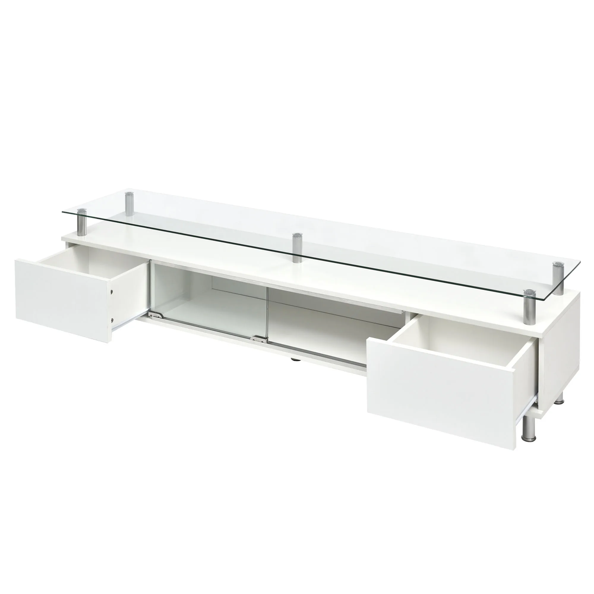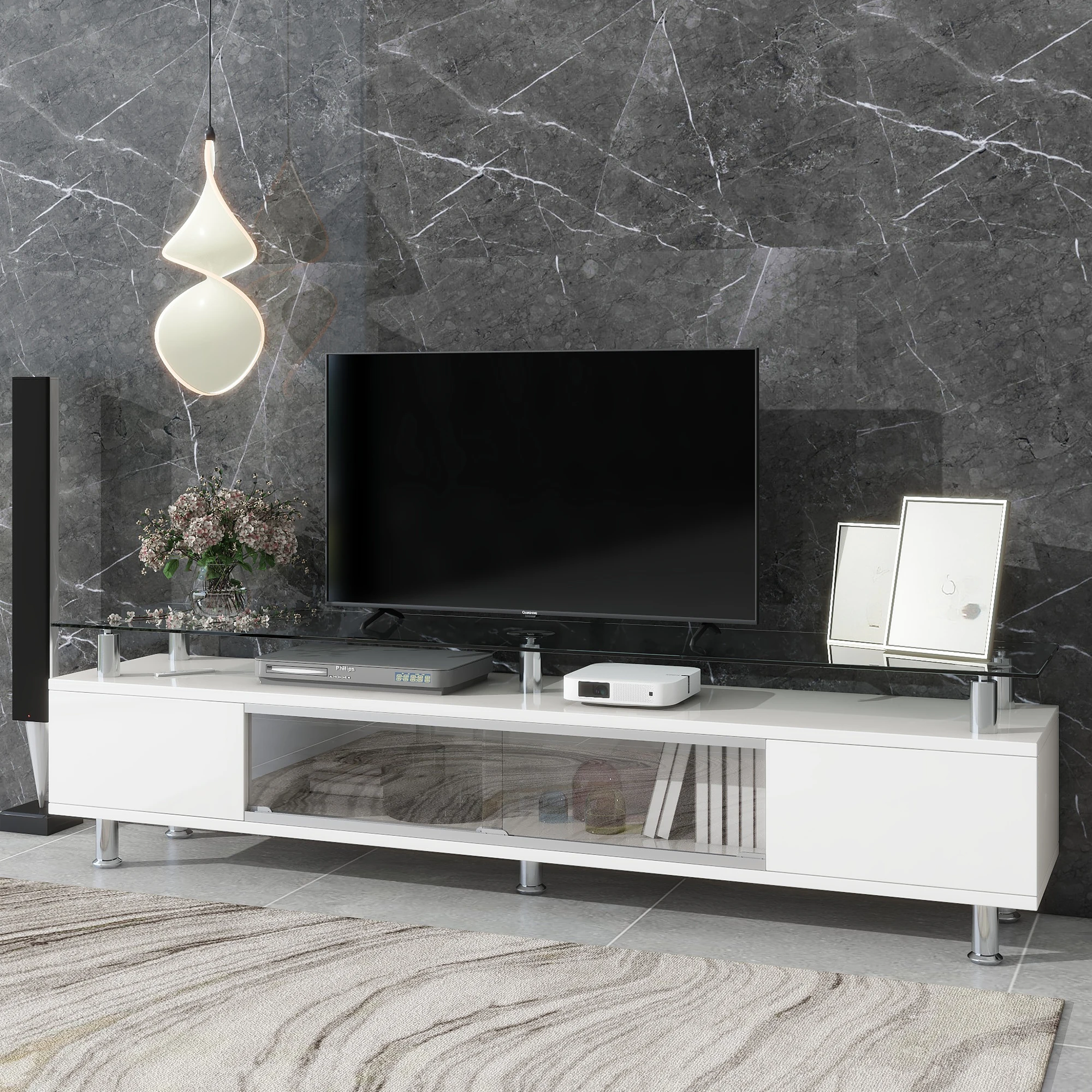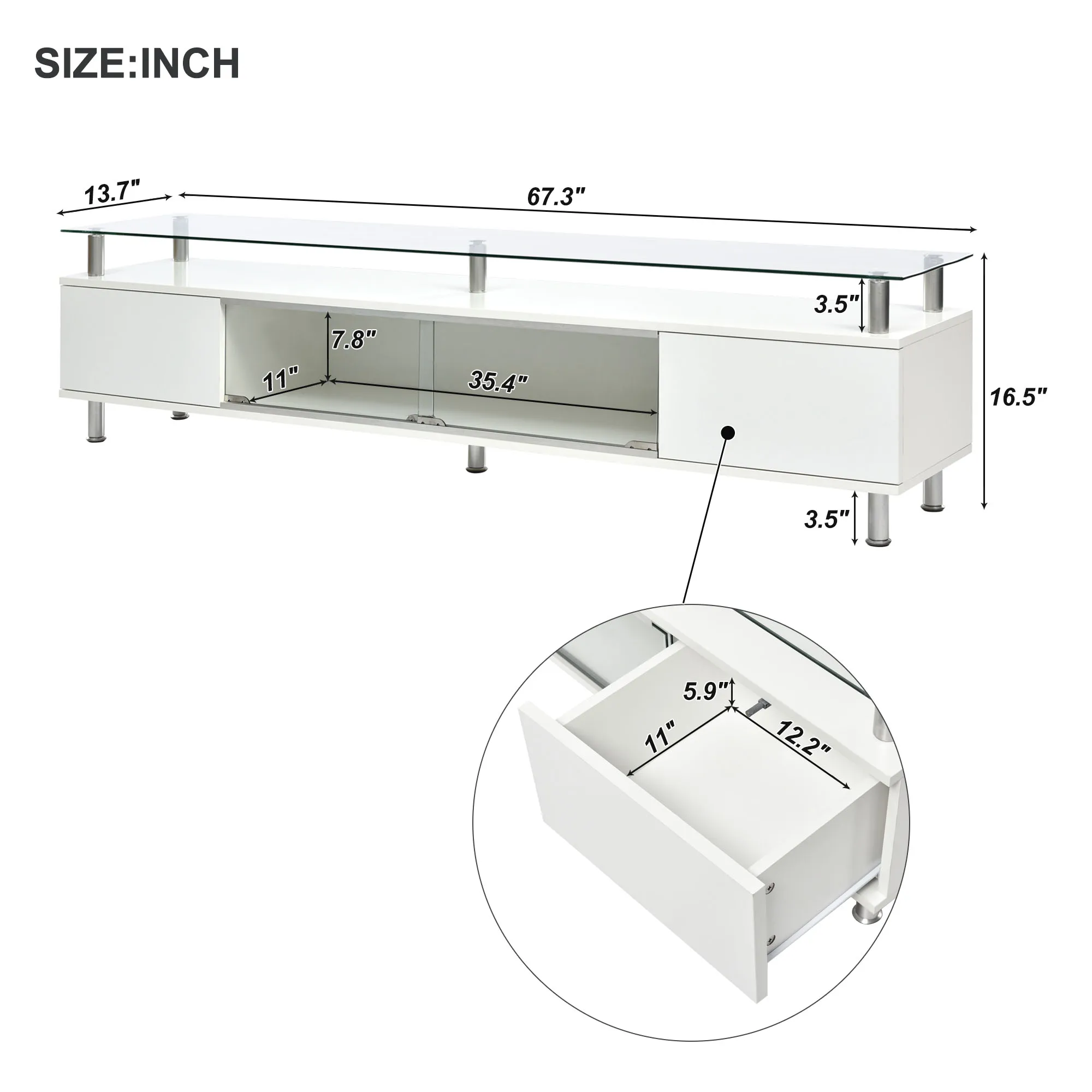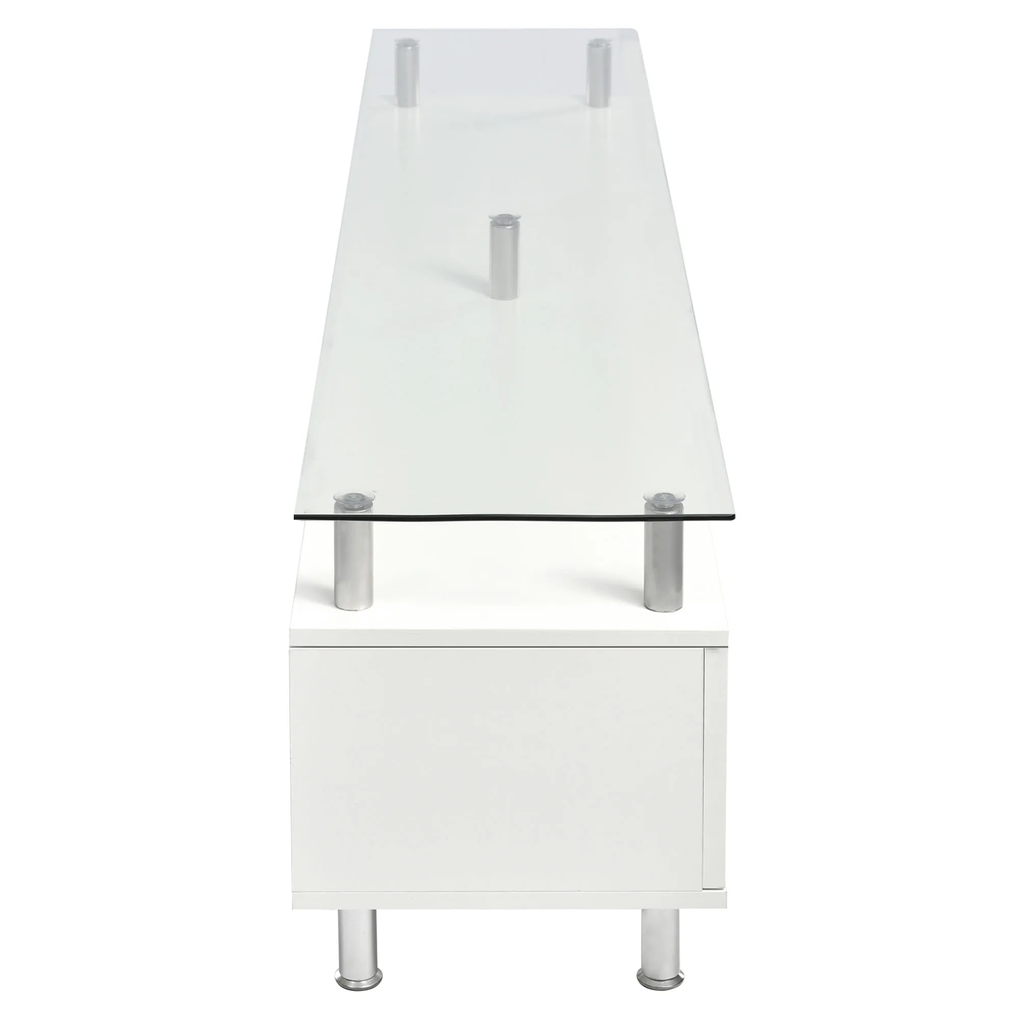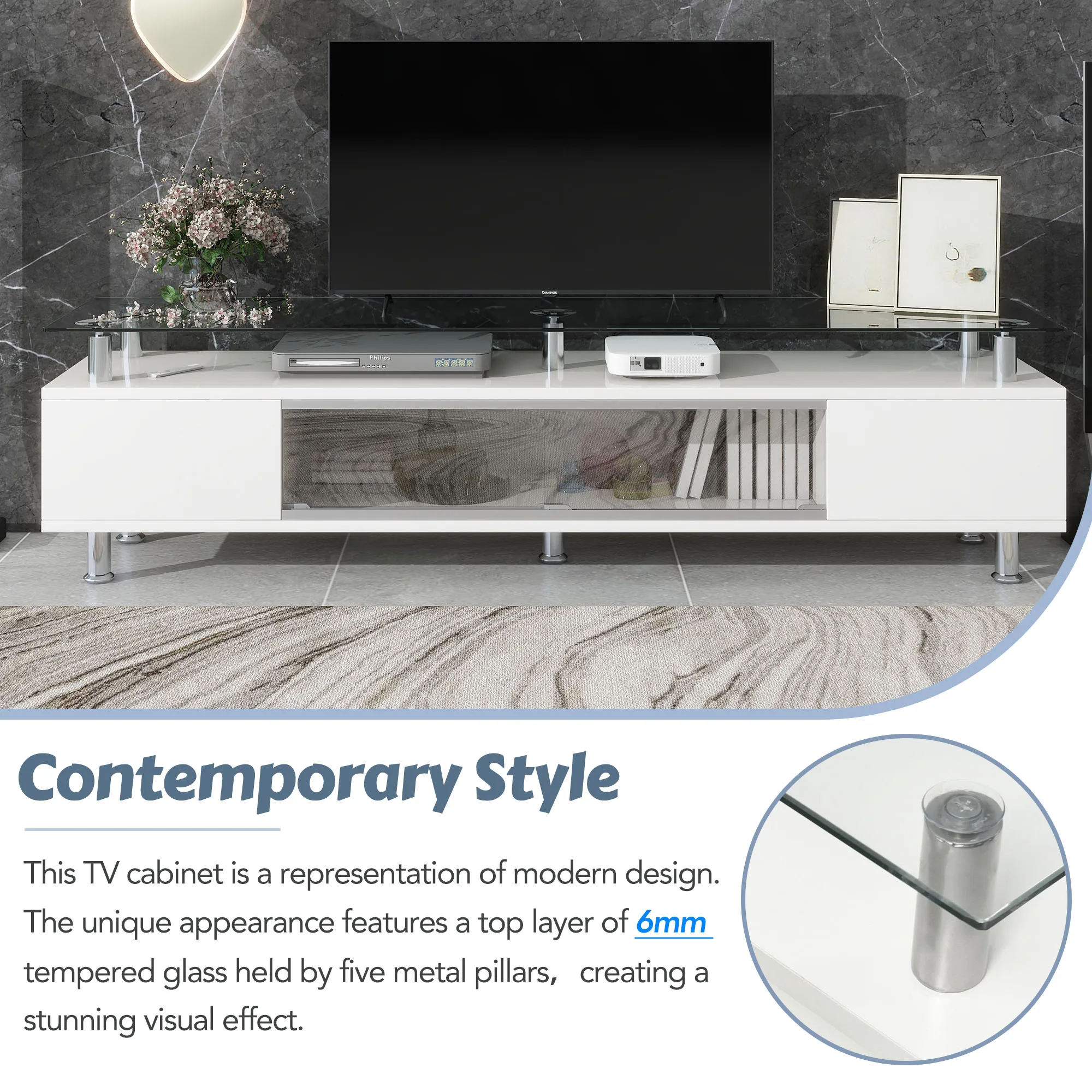 Sleek Design TV Stand with Silver Metal Legs&Ample Storage Capacity Tempered Glass TV Cabinet for TV Up to 70" White/Black[US-W]