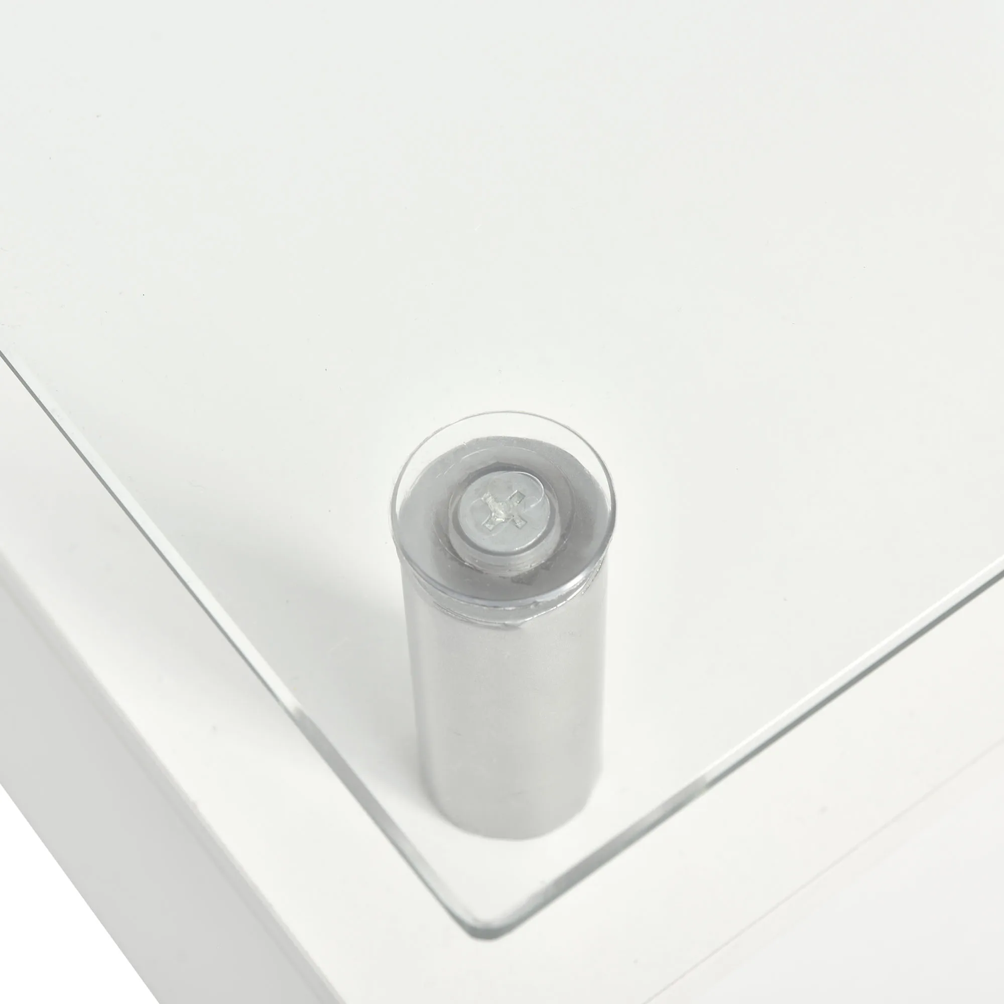 The unique appearance features a top layer of 6mm tempered glass held by five metal pillars, creating a stunning visual effect.