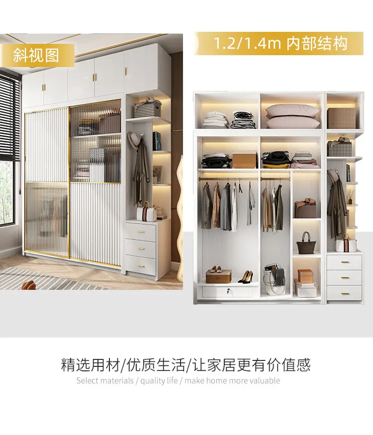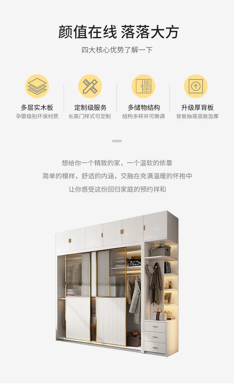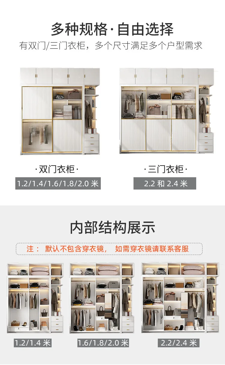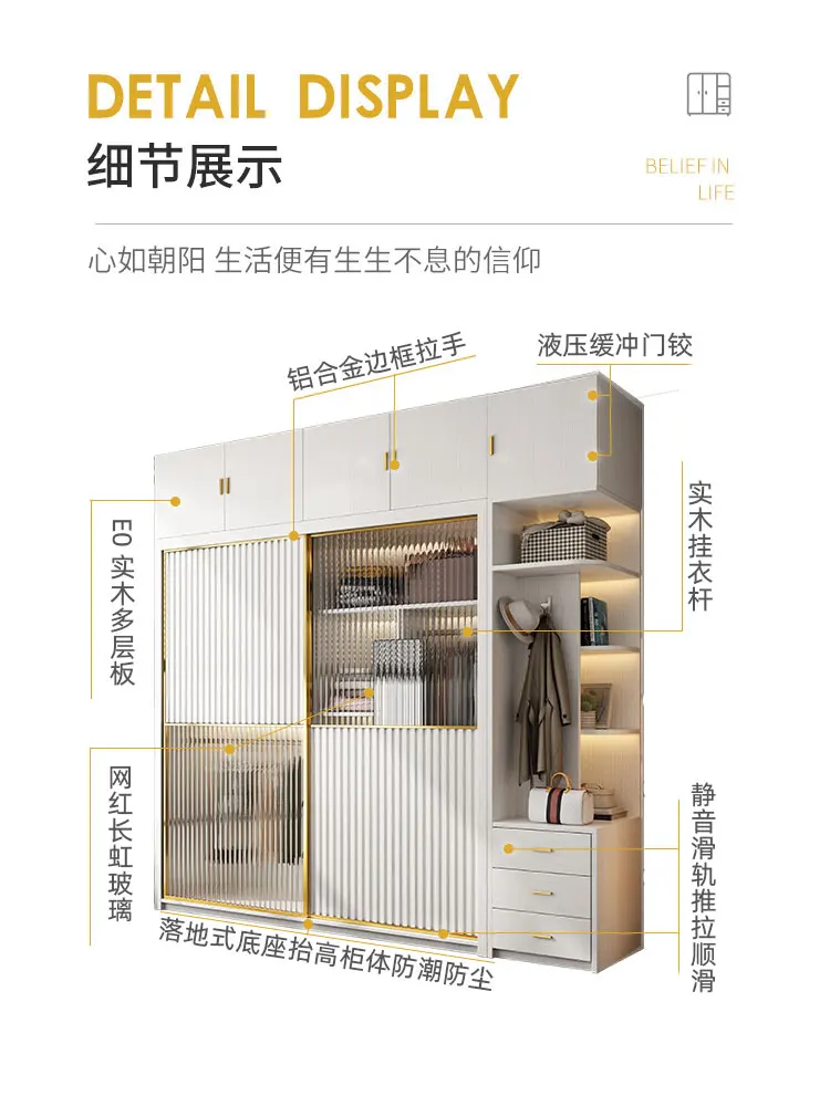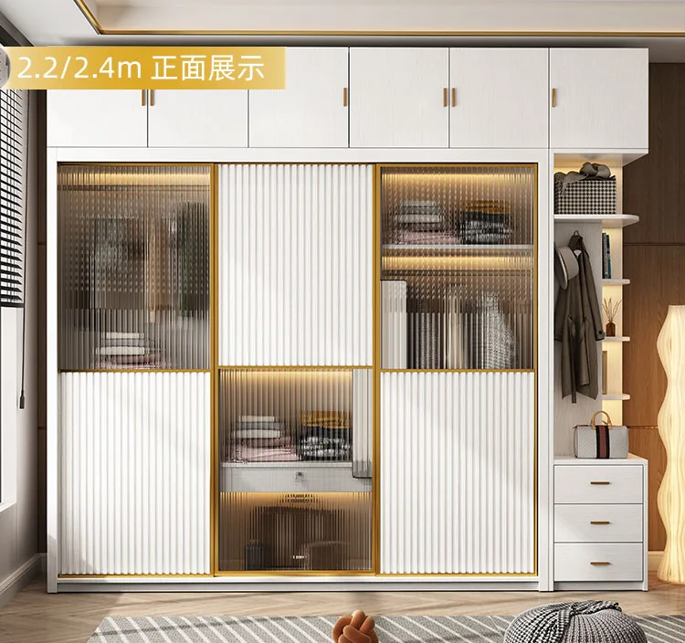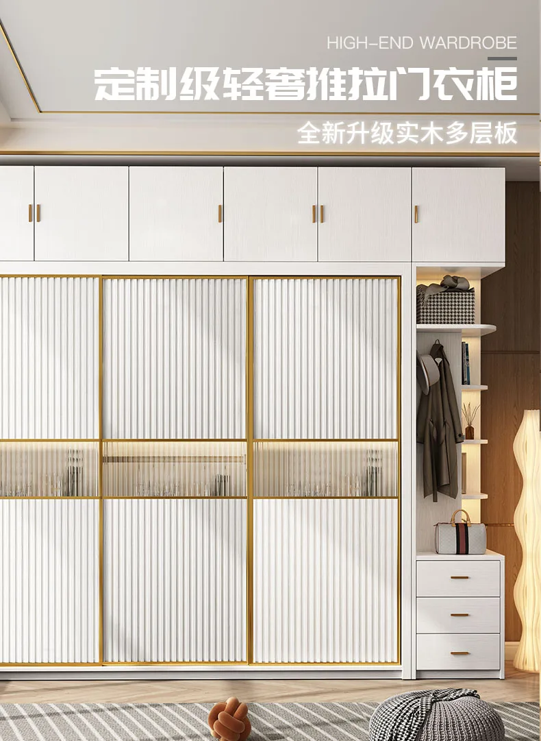 Solid wood multi-layer board, long rainbow glass sliding door, sliding wardrobe, simple modern household bedroom, large cabinet