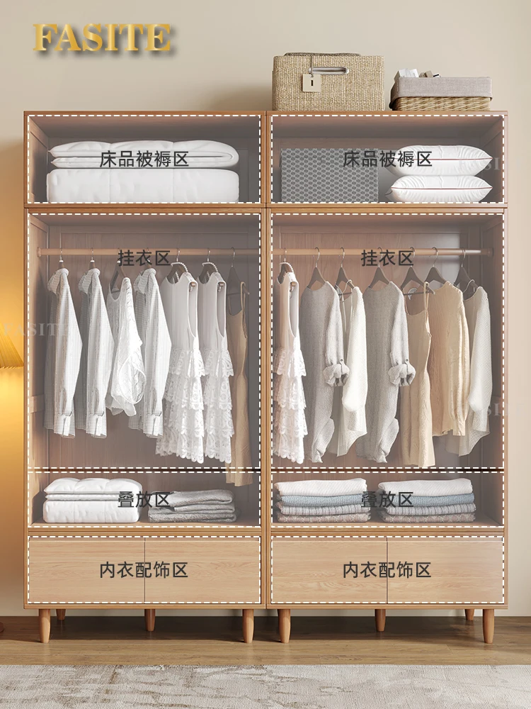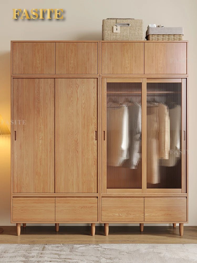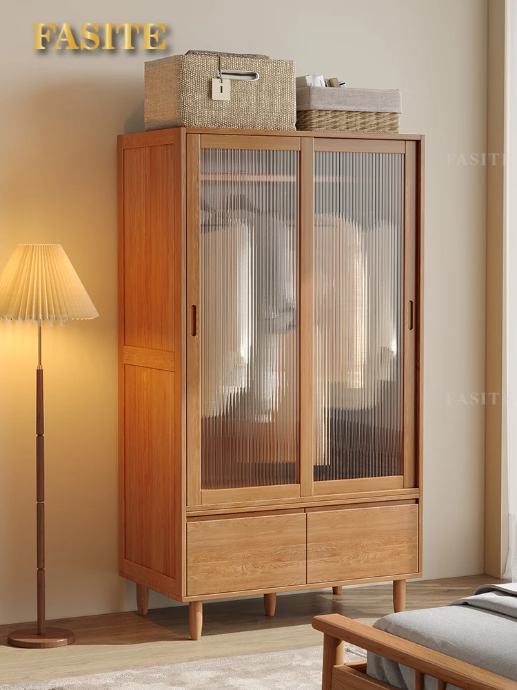 Solid wood wardrobe, home bedroom storage cabinet, small unit, natural wood oak hanging wardrobe, sliding door wardrobe