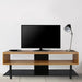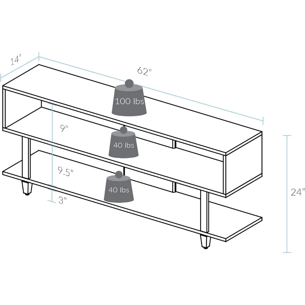 Sharp contrast meets sleek symmetry in our urban industrial inspired Creek TV stand with solid American cherry. Its utilitarian design is expressed through its sharp rectangular angles and wide-open shelves. The two tone finish naturally directs attention to your television while the 2 shelves provide plenty of space for game systems, cable boxes, sound systems, and all your Entertainment essentials. Great for small to large flat screens as well as tight apartments and large living rooms alike. American cherry hardwood provides natural beauty, sturdiness, and durability that can withstand constant use.