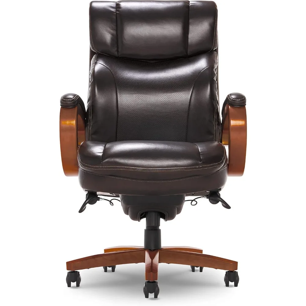 The Big and Tall Trafford Executive Office Chair combines a timeless design with premium comfort to add a refined look to any office space. This big and tall leather office chair delivers all the extra room you need at your desk. It features memory foam ComfortCore cushions that contour to your body and AIR Lumbar Technology to support your back at every angle. Soft, padded armrests and adjustable height, recline, and tilt functions allow you to find the perfect settings to stay comfortable all day. The brown bonded leather upholstery and darkly stained wood construction are an ideal complement for any classically styled office, giving you the ideal mixture of sophistication and support in an ergonomic office chair. The casters are intended for use on carpet and not recommended for use on tile or hardwood floors.