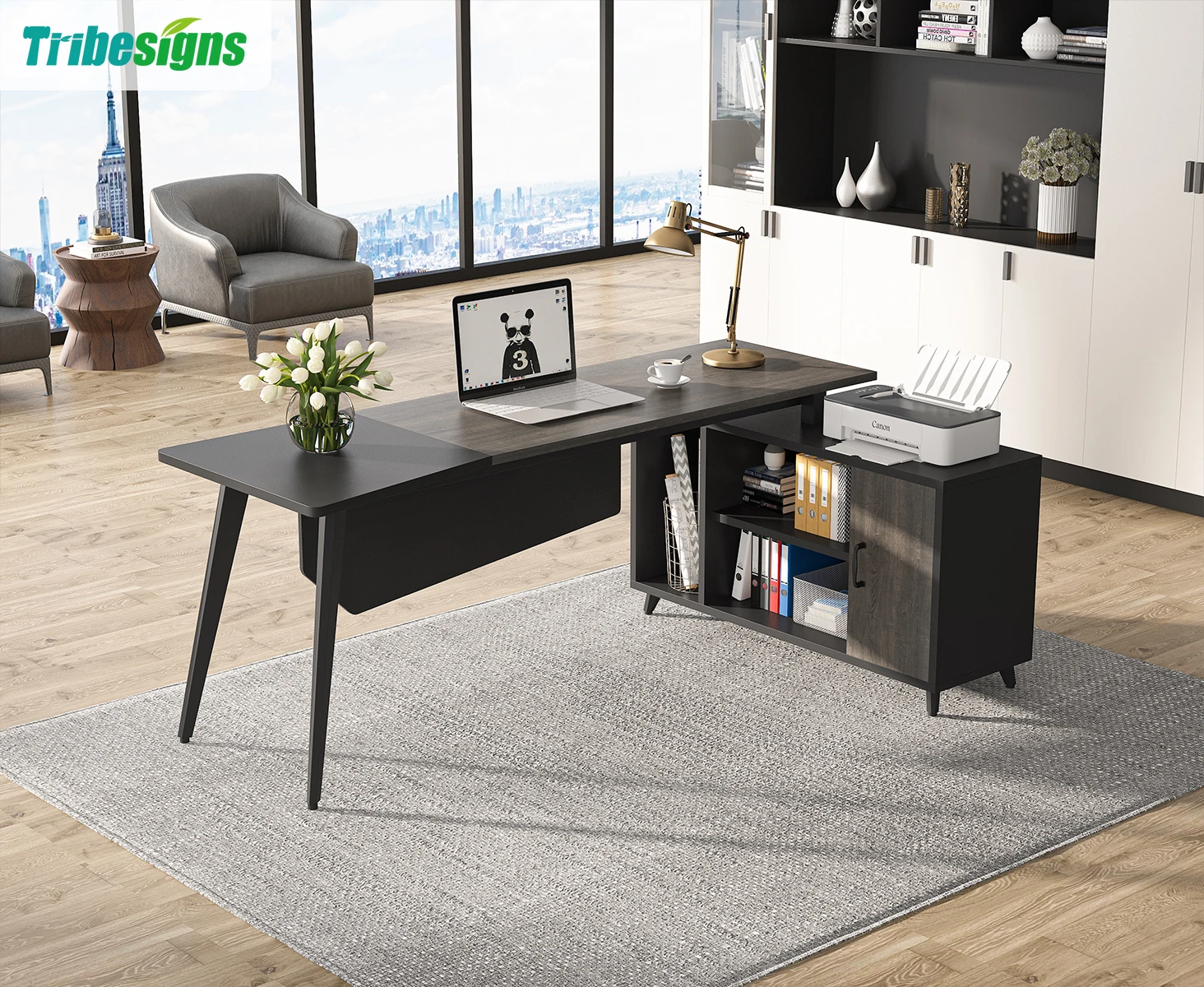 ✔【L Desk with Storage Cabinet】This l desk with multiple shelves: 2 tiers center shelves for files, books and decors; one host storage shelf and a vertical space behind the door for boxes or drafts. The extra countertop of the lateral file cabinet provides more workstation, keeping all reach your arms.