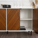 The perfect functional display piece, this book match styled buffet is the piece you didn't know you needed. Comprised of mixed materials of silver hardware and durable laminate doors for a two-toned finish with adjustable rubber feet, the possibilities are endless. Whether placed in your unique kitchen as a traditional buffet or your living room for additional storage, this piece will feel both new and familiar with its midcentury modern appeal.
