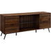 Improve your living room with our TV stand. Featuring a middle glass shelf and closed storage on both sides for you to have a place for your media essentials or décor, whether in your living room or bedroom. The sleek metal hardware, angled legs, and boxy frame create an overall midcentury modern aesthetic. With a cord management feature in the back to keep wires tidy, adjustable shelves, and adjustable rubber feet to prevent it from sliding, this storage console will make a practical addition to your home.