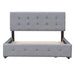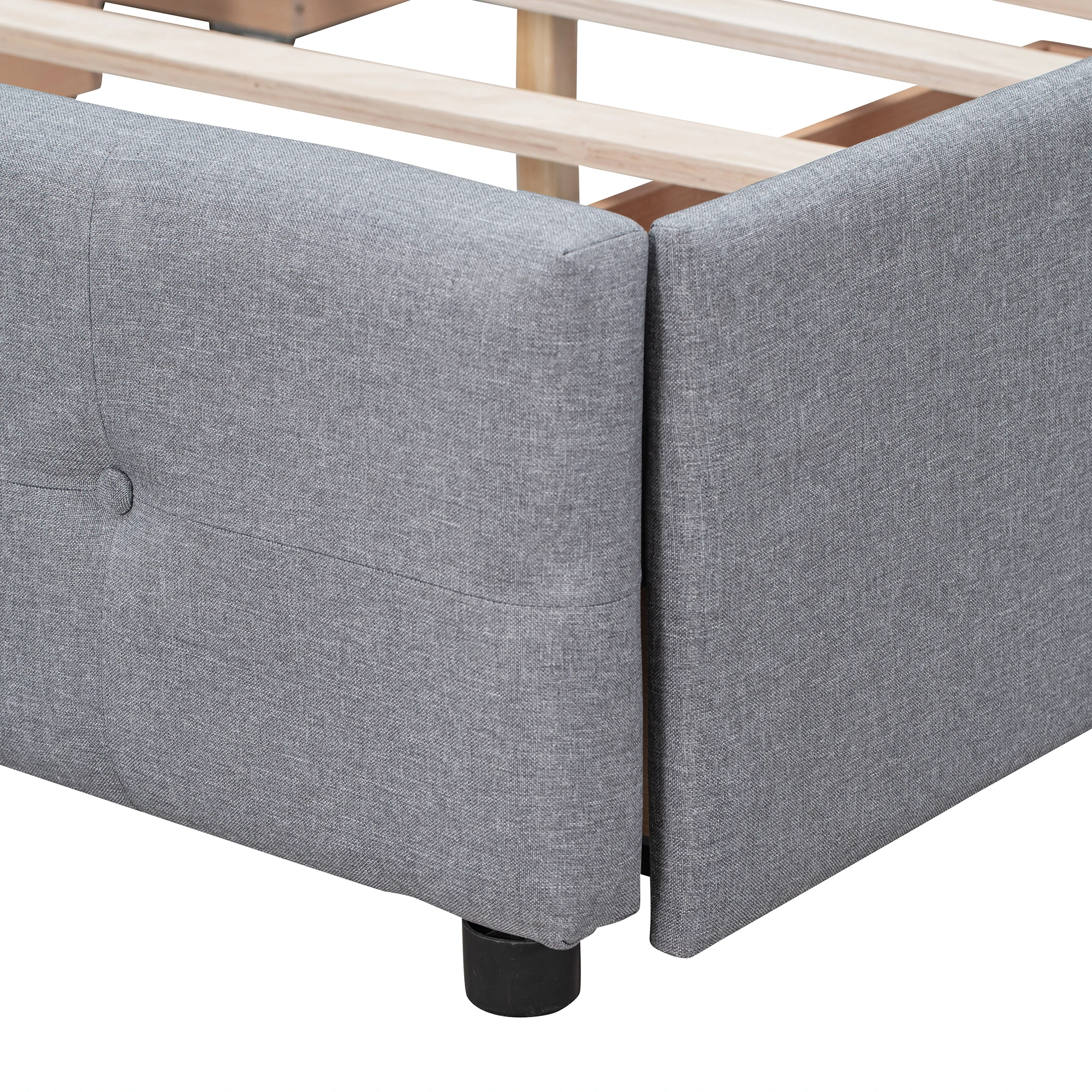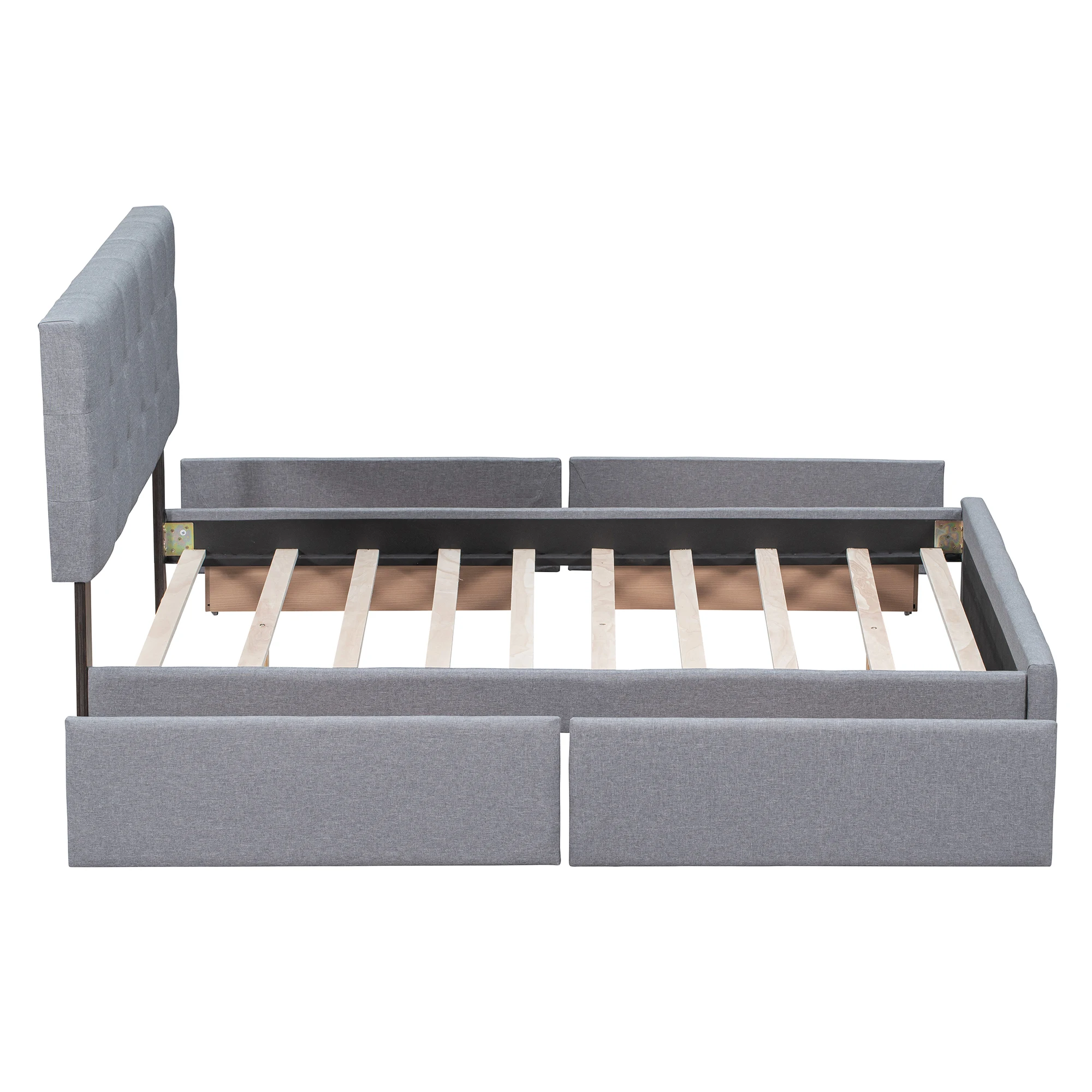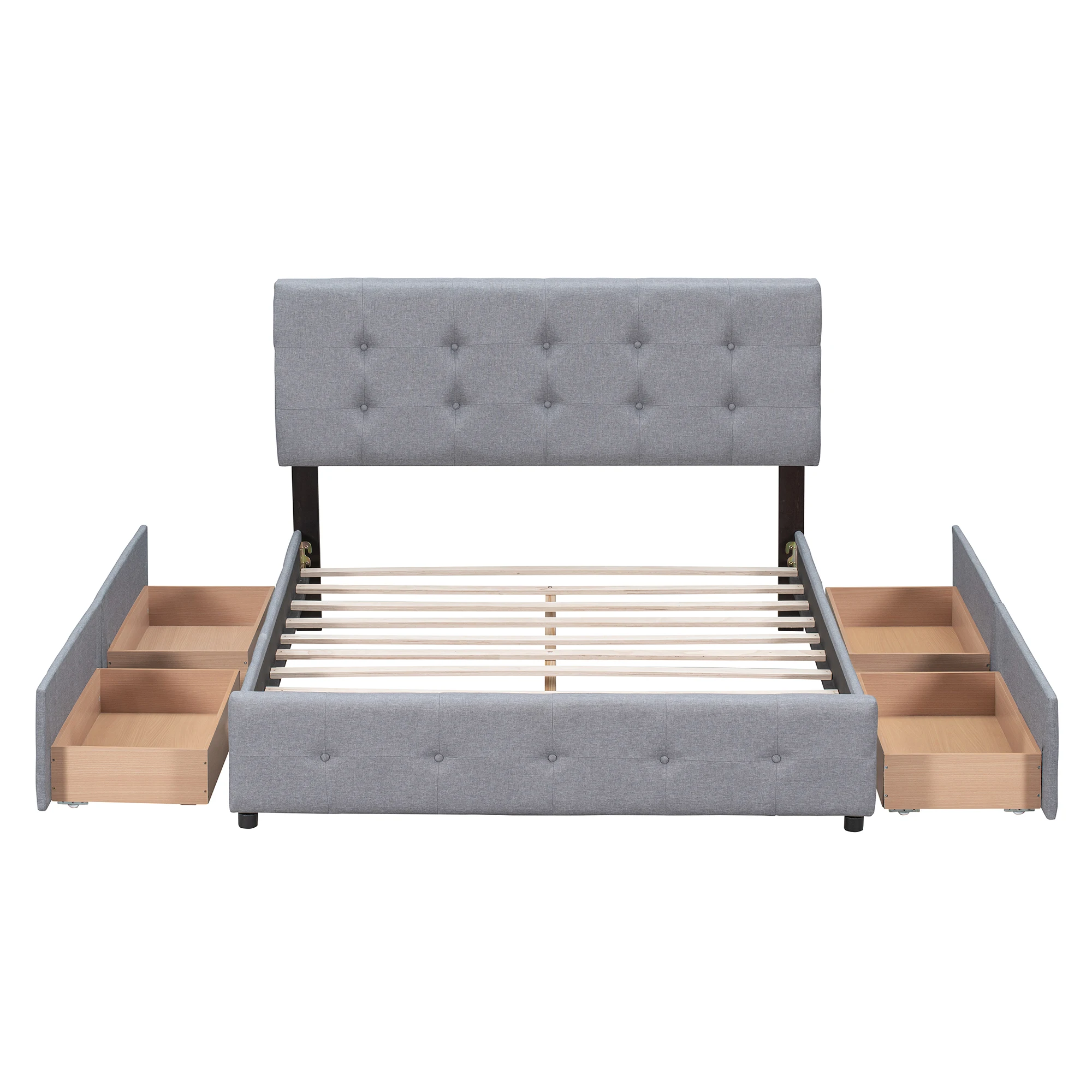 This beautiful Upholstered Platform Bed features button tufted upholstered headboard that adds a contemporary chic look to your bedroom and filled in thick foam to add extra comfort. Sturdy wood frame construction and a wooden slat system to add extra stability and safety.Despite its size and solidity, this piece comes with hardware and instructions included and anyone can assemble it, without a problem.The upholsteredplatform bed with fourdrawers can easily be pulled in and out for maximum storage space, perfect for organizing anything from clothes and bed linens to toys and games.