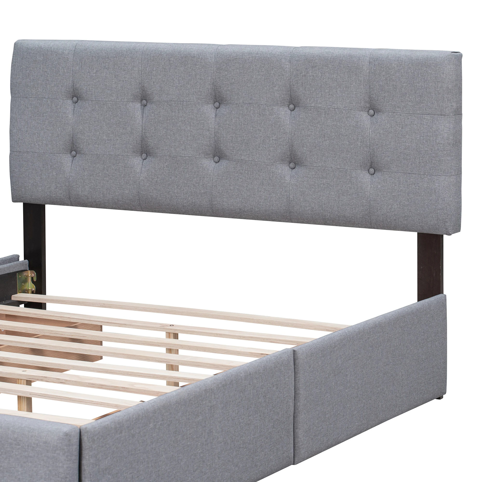 Upholstered Platform Bed with Classic Headboard and 4 Drawers, No Box Spring Needed, Linen Fabric, Queen Size Light Gray