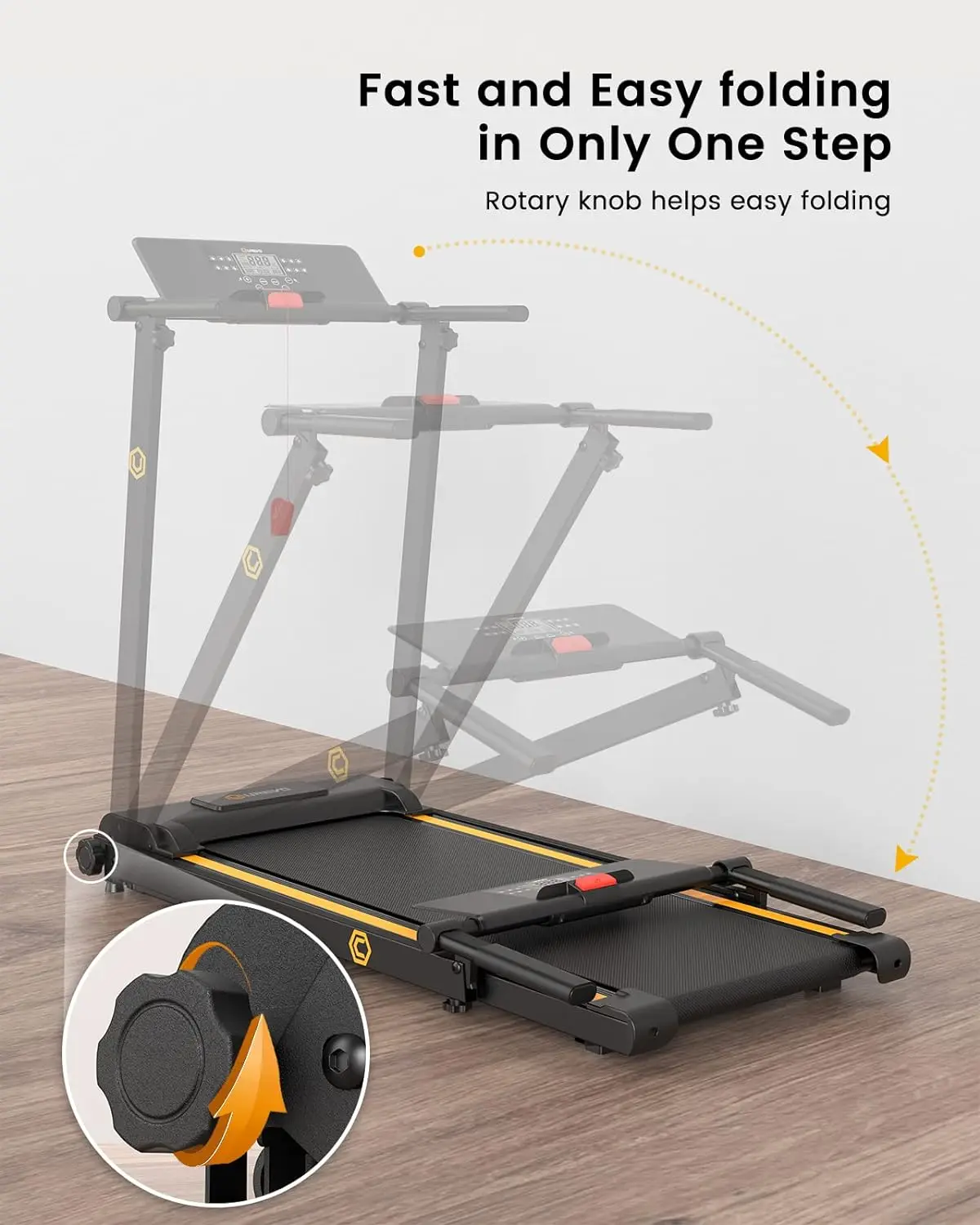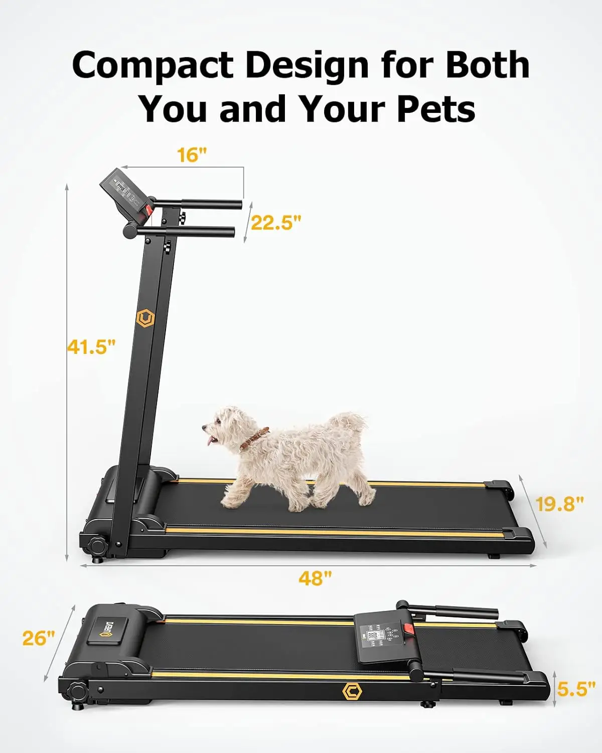 - Easy-to-fold Design to Improve Space Utilization: Folding it in only one step! The folding size is 48x26x5.5 inch (L x W x H). The compact design also makes it easier to store anywhere, even under the bed or sofa, taking up minimum space. UREVO new folding treadmill is now smaller and more convenient, weighing only 22.5kg.