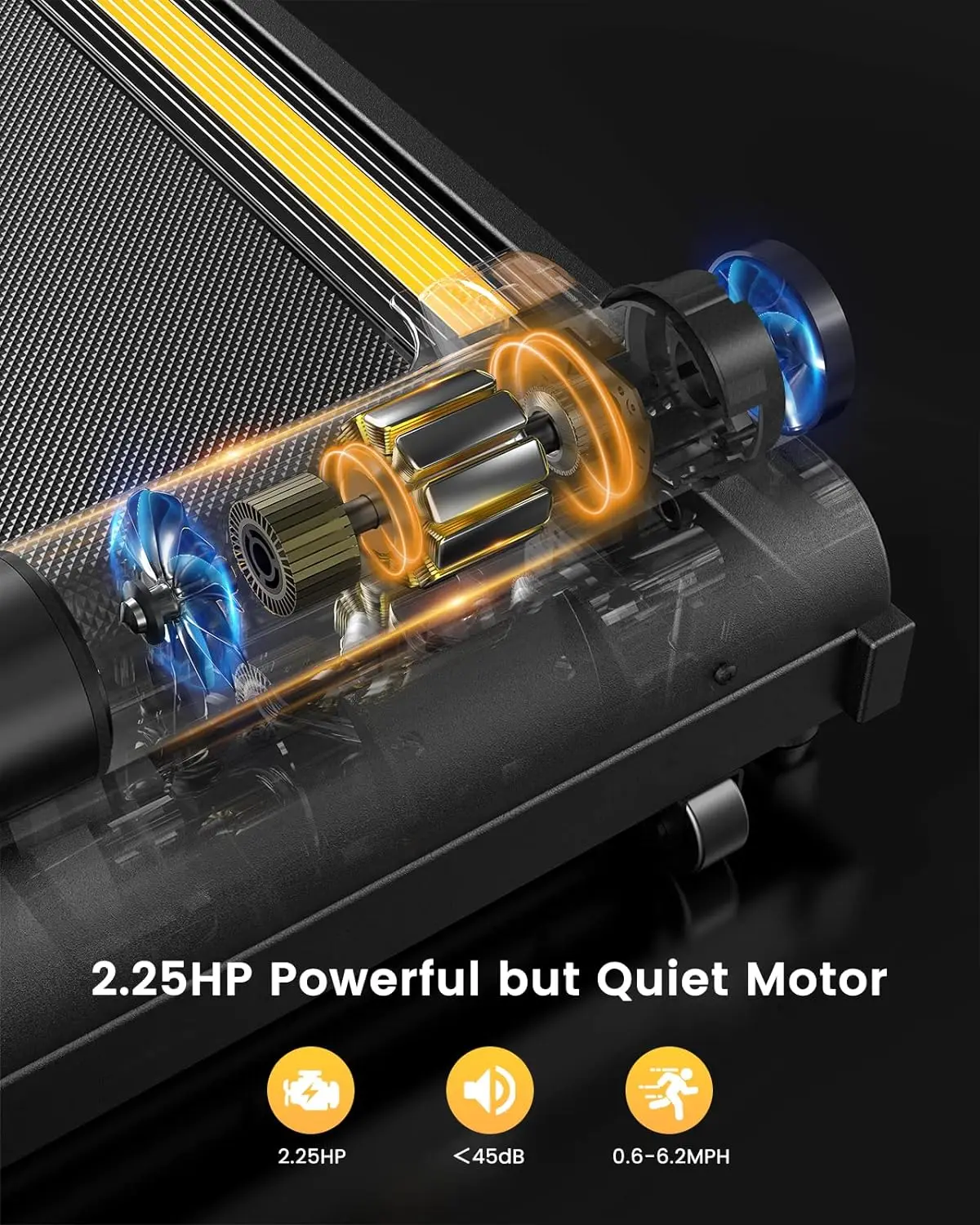 - More Powerful Performance Makes Running Like Outdoors: 2.25 HP Motor provides speeds of 0.6-6.2 MPH which guarantee the stable operation of the machine with 220lbs weight capacity. The motor runs more quietly and will never disturb other people. Five-layer non-slip running belt is more durable and quiet. The one-piece pressing technology makes the running belt splicing smoother.