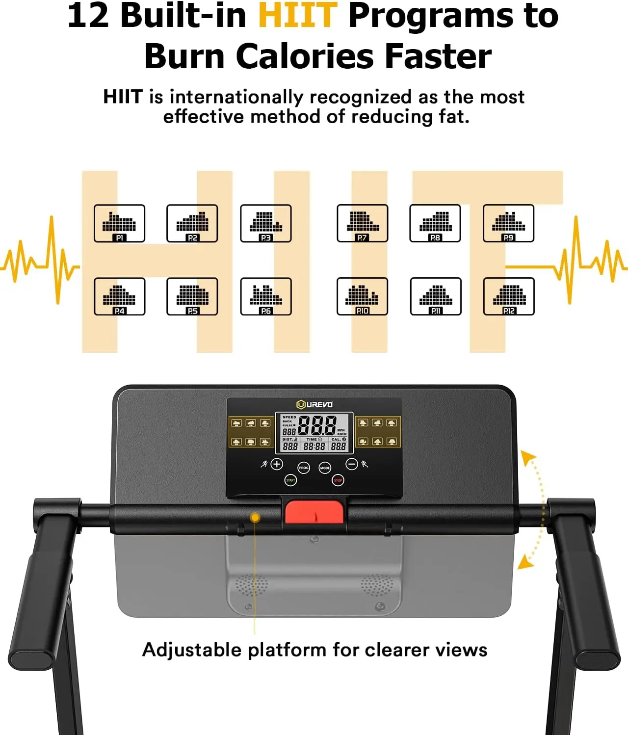 - Most Effective Running Modes of Reducing Fat: HIIT is internationally recognized as the most effective method of reducing fat. To burn calories more effectively, we specially programmed 12 different HIIT running setting, with the help of these preset training plans, you can choose the best plan to suits your need. Also, the adjustable LCD platform will keep track of your exercise data, such as speed, time, distance and calories.