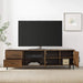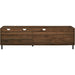 Find the perfect base for your TV with this modern low-profile entertainment center. It's the ideal blend of open and closed storage and cord management so you can easily set up components on display or tucked away. There are two drawers on metal telescoping glides and two doors with adjustable soft close hinges that each feature an adjustable shelf behind them. Made of warp-resistant MDF, durable laminate, and study powder-coated steel, this streamlined TV console has a stylish and long-lasting build.