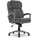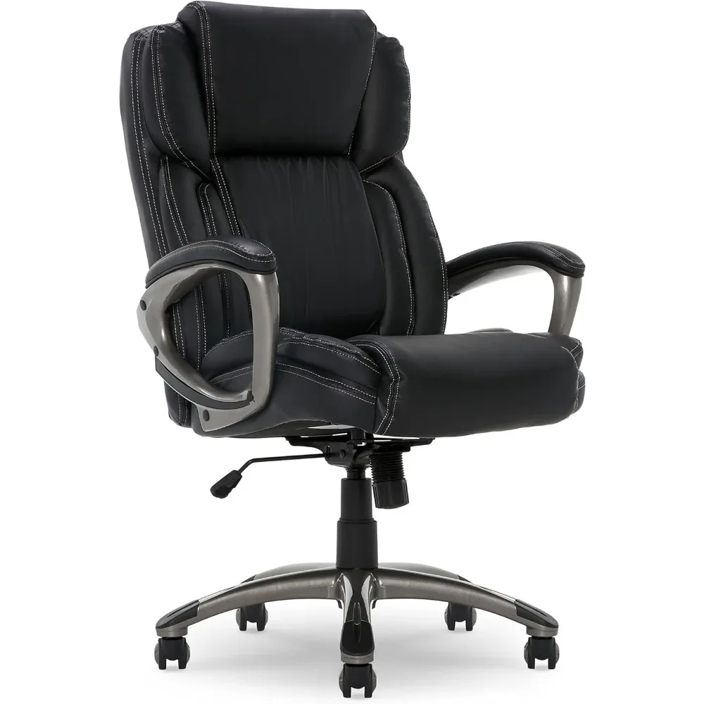 Bring relaxation to your busy workday with the Executive Office Chair. kept comfort in mind while designing this desk chair with luxurious layered body pillows, a contoured lumbar zone, and padded armrests for all day ease and exceptional support during long periods of sitting. The waterfall seat edge reduces pressure on the back of the legs and increases circulation, which helps decrease fatigue while seated. The ergonomic office chair features both recline and seat-height adjustment settings, allowing you to find your optimal seating position. The heavy-duty painted base with scuff-resistant foot pads is designed for long-lasting, reliable use. This desk chair is upholstered in supple bonded leather with contrast stitching. It measures 26-inches wide by 30-inches deep by 44-1/2-inches high and comes with a one-year limited warranty.