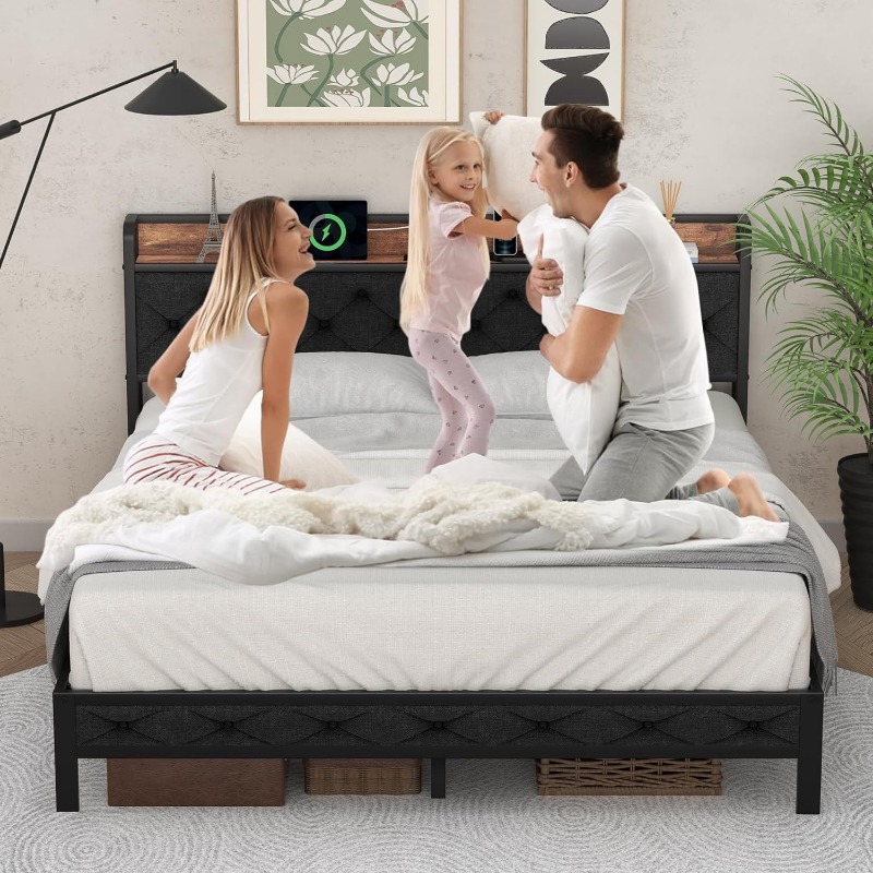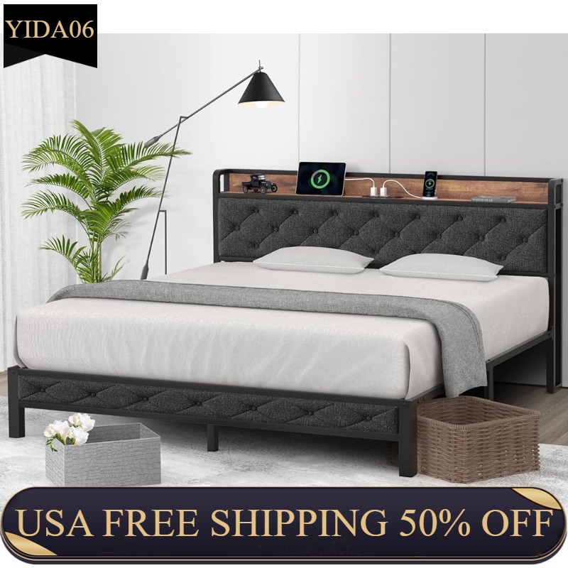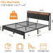 Bed Frame with Headboard, Bed Frame with Charging Station, Metal Platform Bed Frame Full No Box Spring Needed, Modern Wood Upholstered Headboard and Under Bed Storage